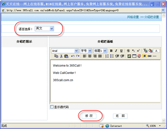 | 再次點擊“系統(tǒng)設(shè)置”->“風(fēng)格設(shè)置”->“主動邀請設(shè)置”,彈出主動邀請設(shè)置頁,在“語言選擇”選擇要設(shè)置的語言種類,輸入完畢信息后,點擊“修改”按鈕: |