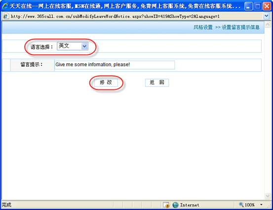 | 再次點擊“系統(tǒng)設(shè)置”->“風(fēng)格設(shè)置”->“自動應(yīng)答”,彈出自動應(yīng)答信息設(shè)置頁,在“語言選擇”選擇要設(shè)置的語言種類,輸入完畢信息后,點擊“修改”按鈕: |