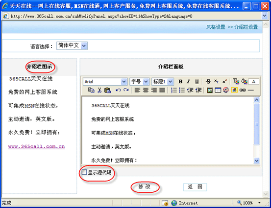 上圖中,如果勾上“顯示源代碼”可編輯 HTML ,信息編寫完后,點擊“修改”按鈕,則在左邊的“介紹欄圖示”欄顯示剛才編輯的效果。