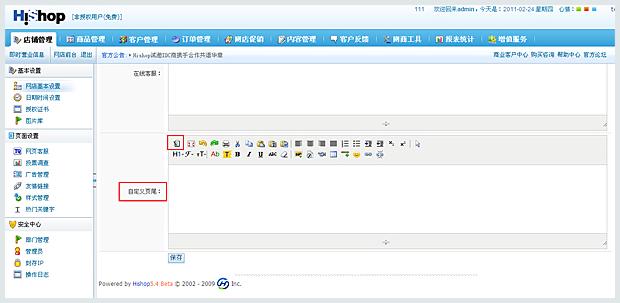 • 獲取在線客服安裝代碼,然后登陸Hishop后臺(tái),進(jìn)入店鋪管理》網(wǎng)店基本設(shè)置,找到“自定義頁(yè)尾”,點(diǎn)擊“HTML代碼”按鈕,把在線客服代碼復(fù)制粘貼到編輯框,點(diǎn)擊保存。